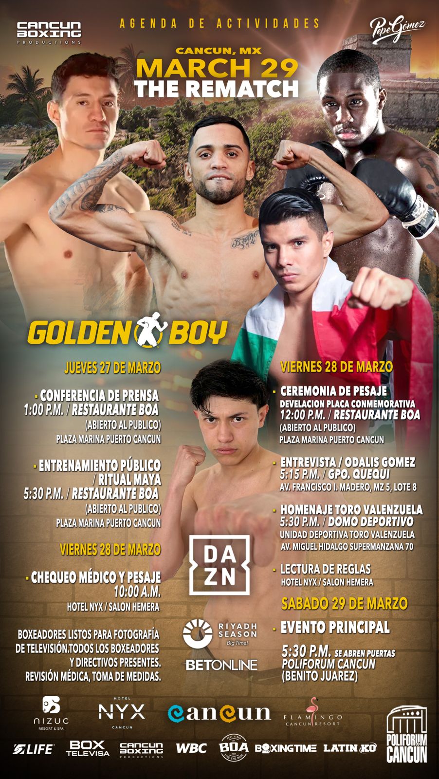 La cuenta regresiva para la gran función “The Rematch” que es presentada por “Golden Boy Promotions” de Oscar de la Hoya y “Cancun Boxing” de Pepe Gómez, ha comenzado y la agenda de actividades iniciará con la llegada de los boxeadores y la conferencia de prensa pactada para el próximo jueves. Pero será este martes cuando los actores principales de esta gran función comiencen a arribar a este polo turístico y es que la adaptación al horario, pero sobre todo al nivel del mar, es una de las principales preocupaciones de los managers que están cuidando todos los detalles de estas super estrellas del mundo del boxeo. Hay que recordar que esta función denominada “The Rematch” ha levantado gran expectación entre el mundo del boxeo y es que la sola presencia de una de las leyendas de este deporte como lo es Oscar de la Hoya, ya ha puesto a Cancún en los ojos del orbe deportivo, sin dejar de mencionar la velada llegará a millones de personas a través de la plataforma DAZN y por la señal de Televisa-Univisión (TUDN) así como del líder mundial en deportes ESPN. El jueves 27 de marzo, será un día ajetreado pero histórico y es que la rueda de prensa en dónde ya han confirmado su presencia más de 60 medios de comunicación, locales, nacionales e internacionales, esta pactada para dar inicio a la una de la tarde (horario de Quintana Roo) y tendrá como sede el restaurante BOA ubicado dentro del complejo comercial Marina Puerto Cancún. Ese mismo jueves, pero a las cinco de la tarde y teniendo como fondo la impresionante vista de la Marina de Puerto Cancún con decenas de yates y barcos en la caleta, se efectuará un entrenamiento público por parte de los boxeadores, exhibición que seguramente le dará la vuelta al mundo por la belleza del lugar enmarcada con la fuerza de los gladiadores. Para el viernes 28 de marzo, en el mismo Restaurante BOA de Puerto Cancún, que esta semana será el lugar del boxeo mundial, se efectuará la Ceremonia de Pesaje a la una de la tarde y al terminar el protocolo oficial, se develará una placa oficial conmemorativa a esta gran función “The Rematch”. Alrededor de las cinco de la tarde, se trasladarán a la Unidad Deportiva “José María Morelos”, mejor conocida como “Toro Valenzuela” en donde habrá una convivencia con boxeadores amateurs y con la gente de la zona, sin dejar de mencionar que Oscar de la Hoya le rendirá un homenaje póstumo al gran Fernando Valenzuela junto a la familia del desaparecido pitcher de los Dodgers, por lo que la familia del gran lanzador sonorense también estará presente. Y el sábado 29 de marzo, a partir de las cinco de la tarde, se abrirán las puertas del Poliforum Cancún para comenzar con la primera pelea de la función, que estará compuesta por 11 combates que iniciarán con lo mejor del pugilismo local y nacional, incluidos los combates de los cancunenses Celex Castro y Joselito Velázquez, para concluir con el plato fuerte de la revancha entre William “camarón” Zepeda y Tevin Farmer por el campeonato interino de los ligeros del Consejo Mundial de Boxeo (WBC).