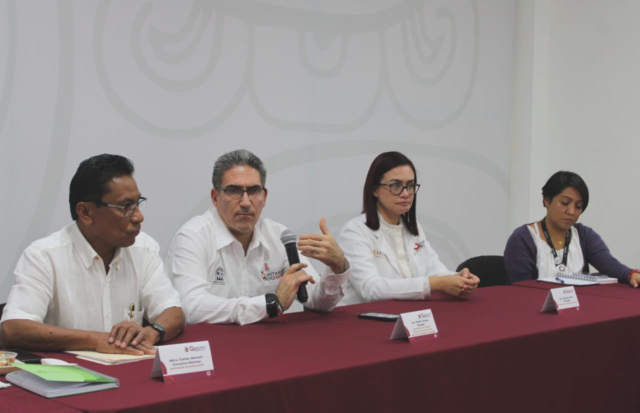 El secretario de Salud y de Educación en el estado, Flavio Carlos Rosado y Carlos Gorocica Moreno, respectivamente, sostuvieron una reunión de trabajo en el que se presentó el panorama general del dengue en Quintana Roo, específicamente en los planteles educativos.