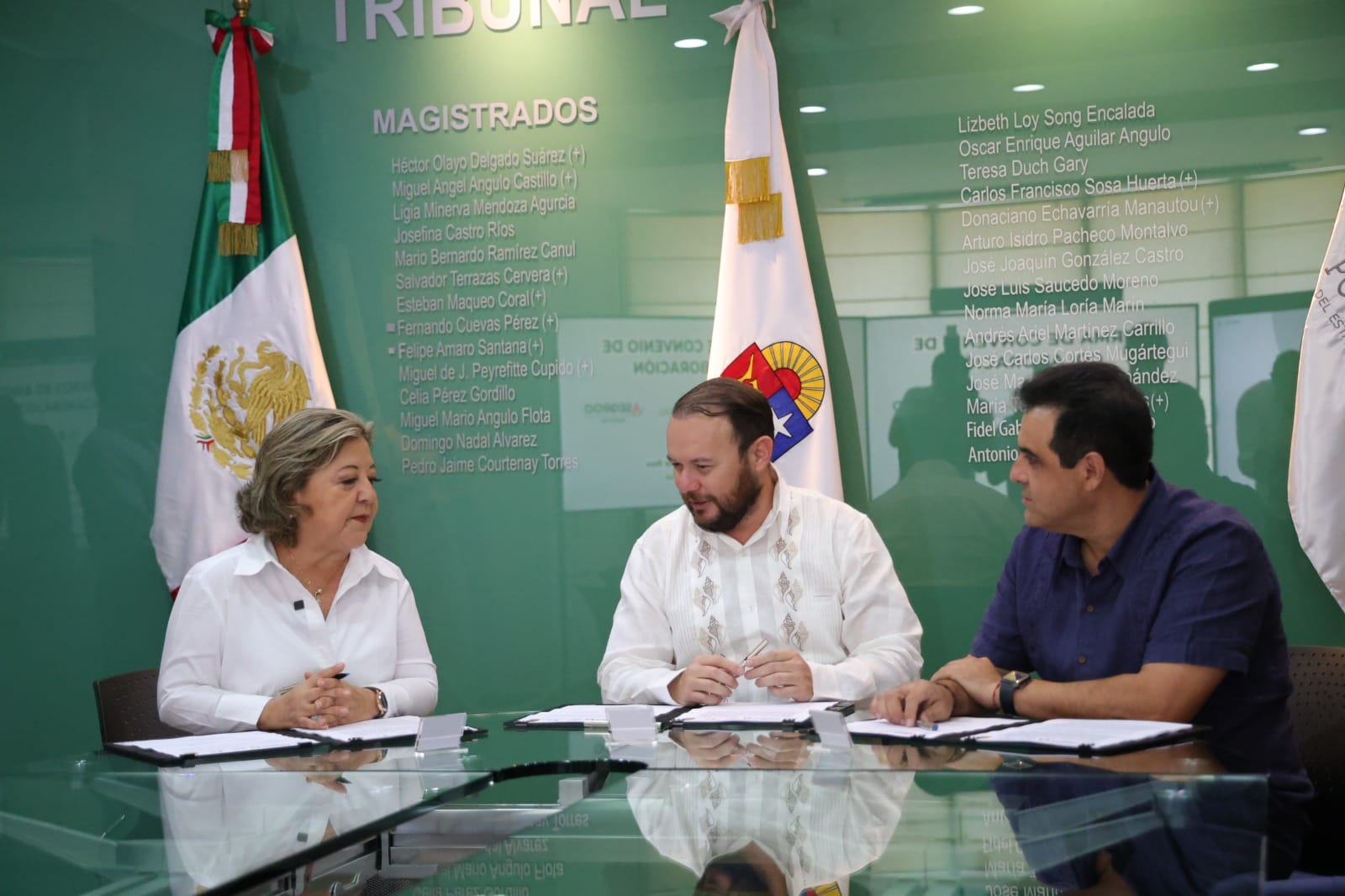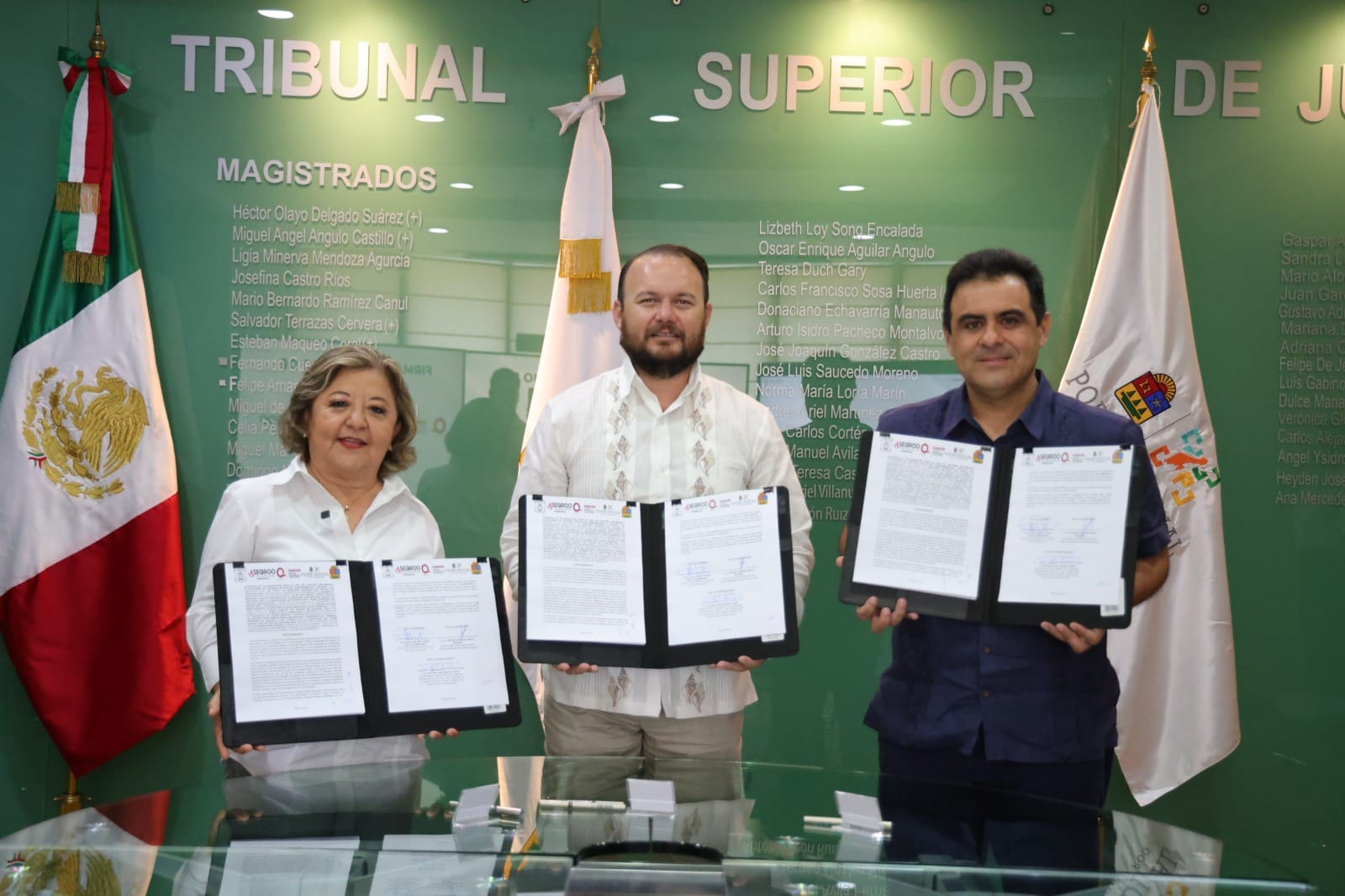 En la firma de este convenio participaron la titular de SABGOB, Reyna Arceo Rosado; el Auditor Superior del Estado, Miguel Zogby Cheluja Martínez; y el Magistrado Presidente del Tribunal Superior de Justica y del Consejo de la Judicatura del Poder Judicial del Estado de Quintana Roo, Heyden José Cebada Rivas.