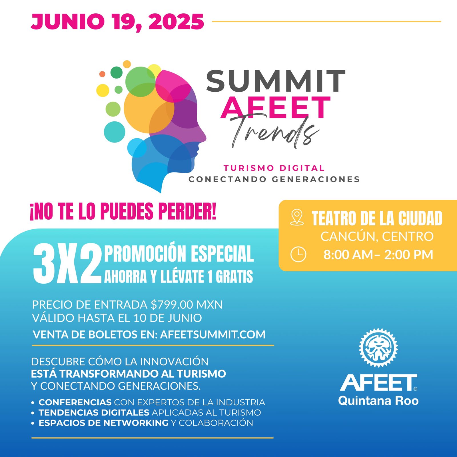 Este summit se llevará a cabo el 19 de junio del presente en el Teatro de la Ciudad, en Cancún, a partir de las 8:00 am y hasta las 2:00 pm. Contará con la participación de destacados conferencistas y expertos en innovación digital, ventas estratégicas y transformación tecnológica, quienes compartirán herramientas prácticas e ideas de vanguardia para afrontar los retos actuales del turismo. El costo de acceso general al Summit AFEET Trends es de $799.00, con promociones especiales por compra anticipada. Igualmente existen promociones para estudiantes y para asociaciones u organizaciones. Los boletos están a la venta en línea en el sitio oficial.